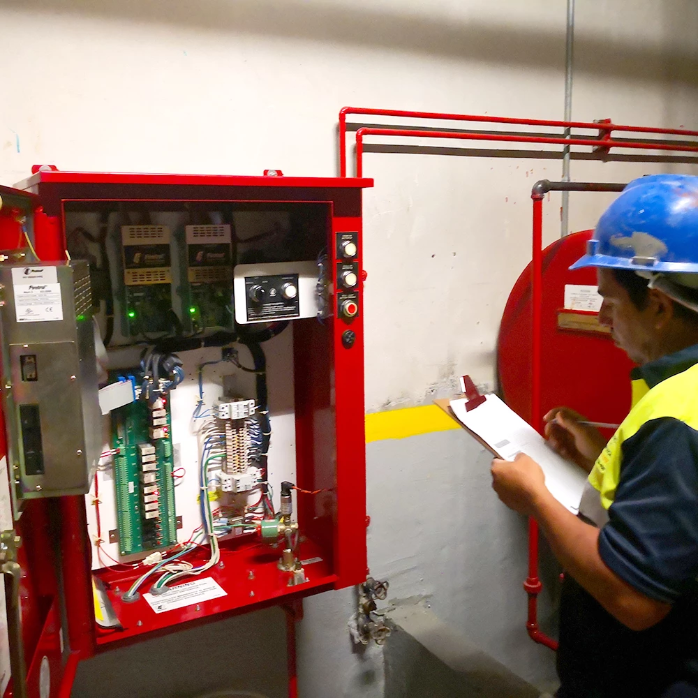 Inspección de equipos de extinción de incendios, como bombas y rociadores automáticos.